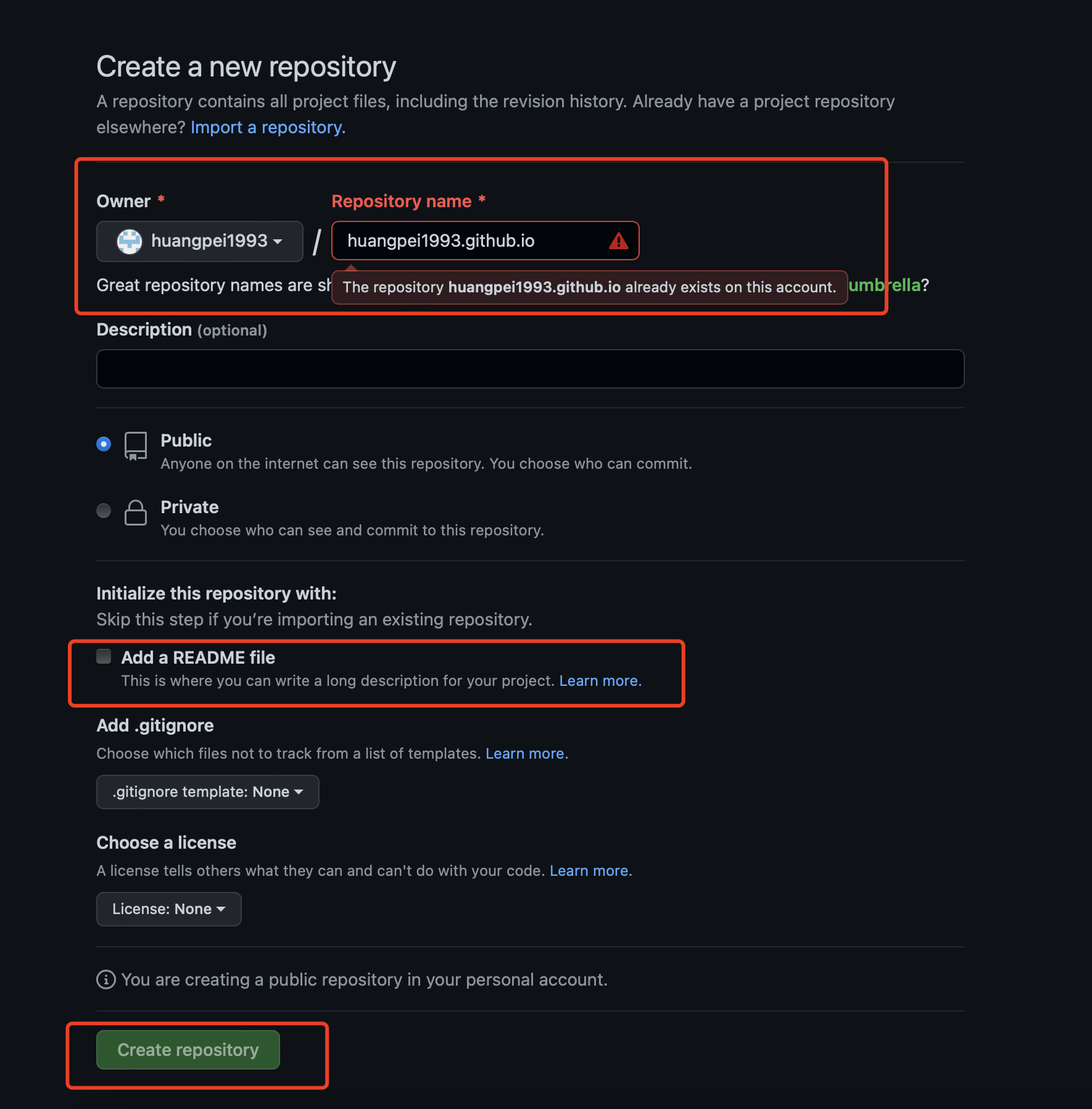 Repository name 中输入 用户名.github.io