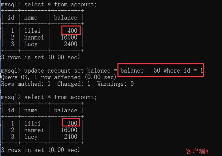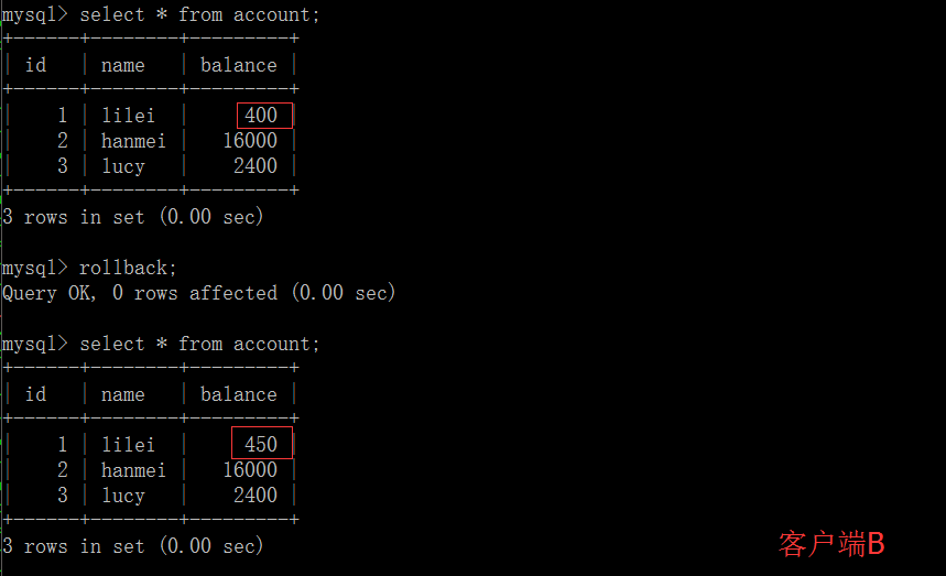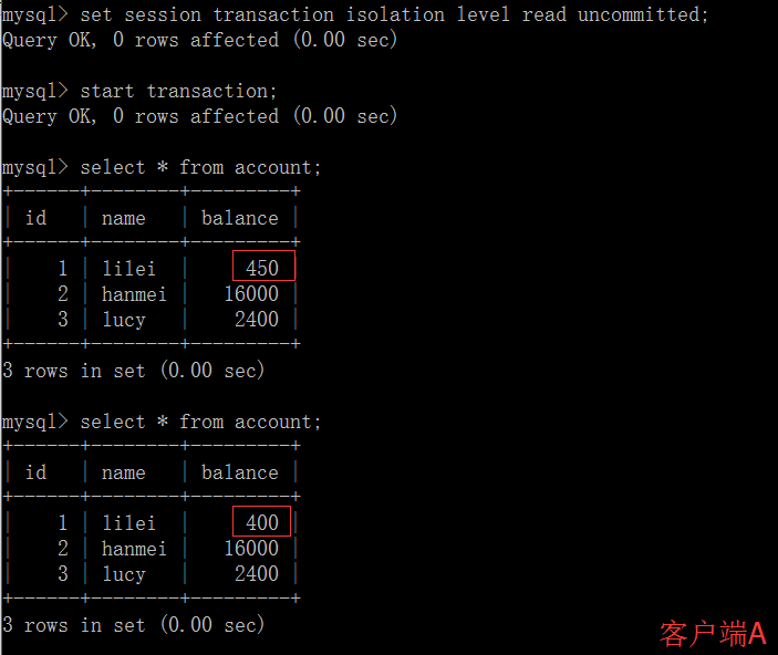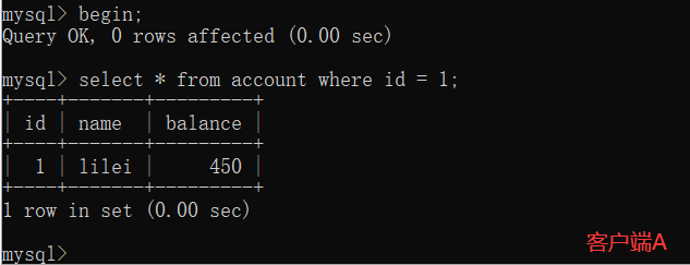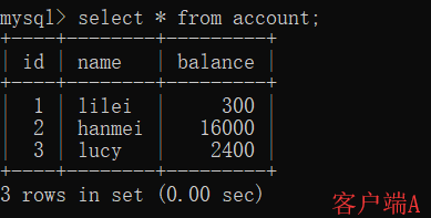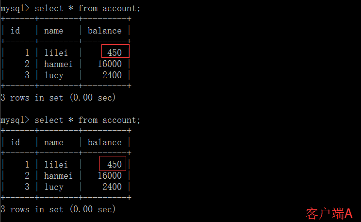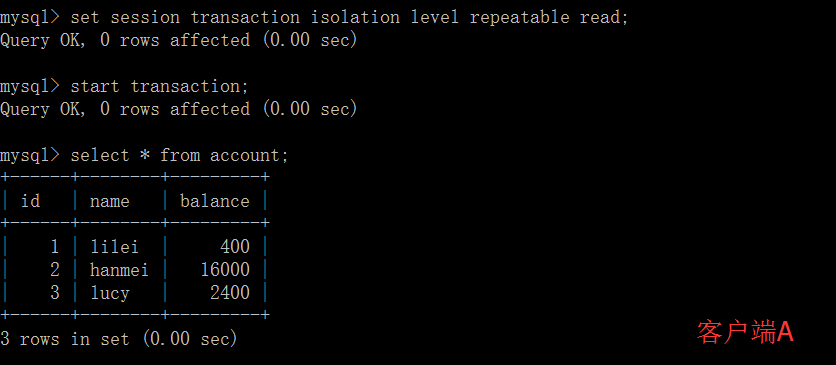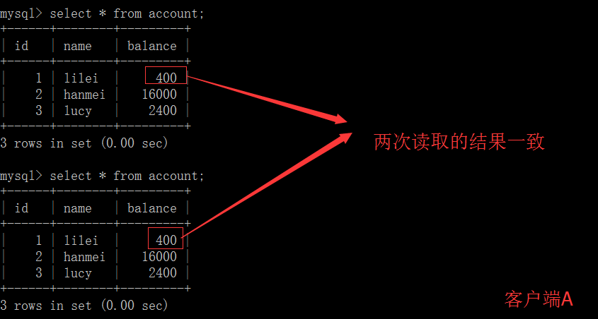 (3)在客户端A查询表account的所有记录,与步骤(1)查询结果一致,没有出现不可重复读的问题