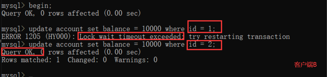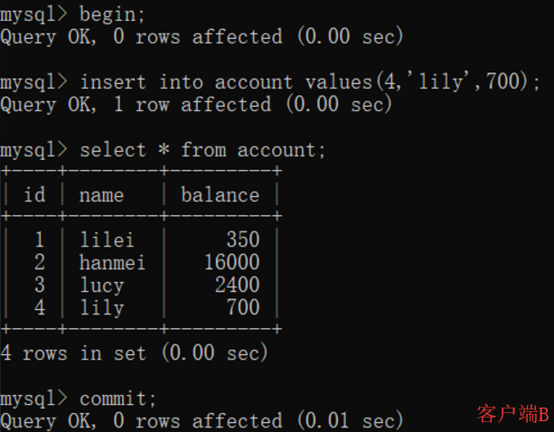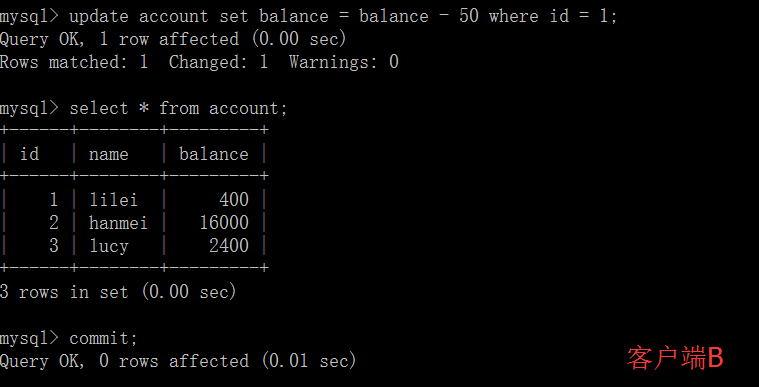 (2)在客户端A的事务提交之前,打开另一个客户端B,更新表account并提交