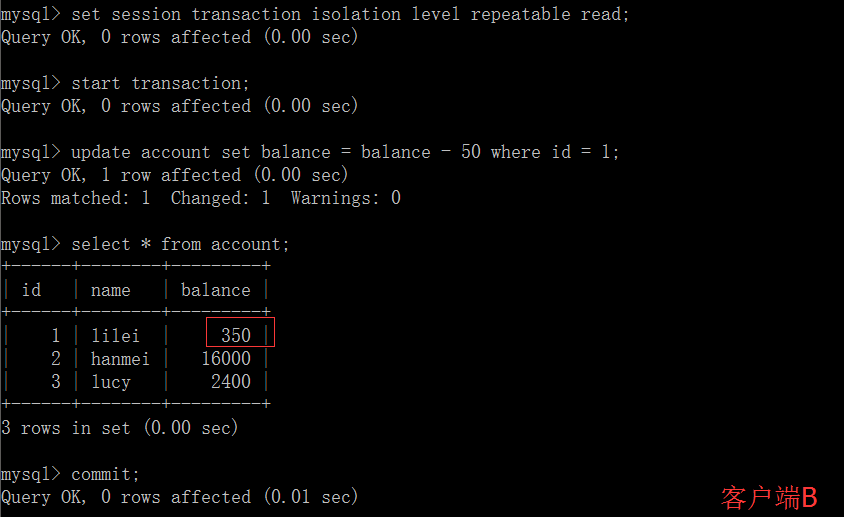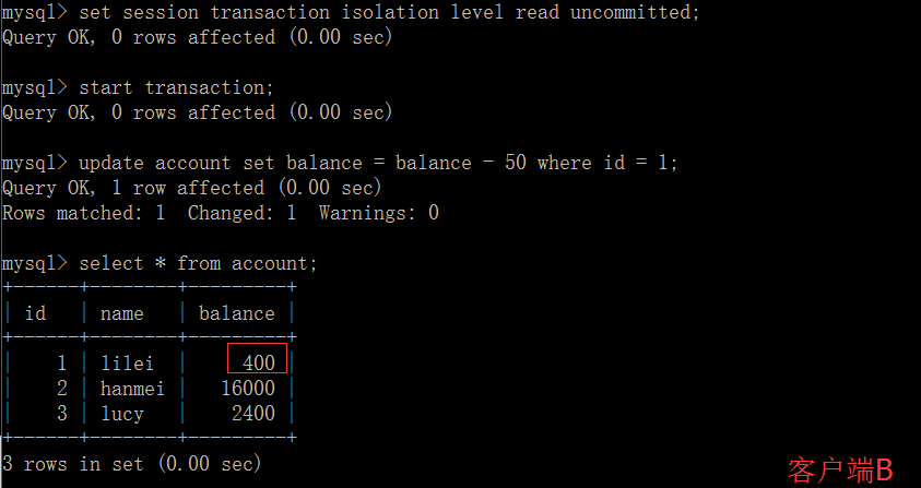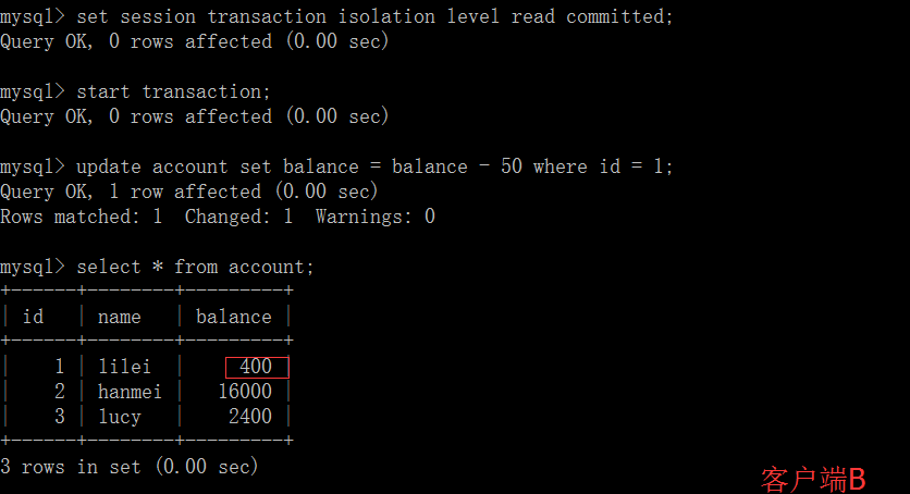 (5)在客户端A执行更新语句update account set balance = balance - 50 where id =1,lilei的balance没有变成350,居然是400,是不是很奇怪,数据不一致啊,如果你这么想就太天真了,在应用程序中,我们会用400-50=350,并不知道其他会话回滚了,要想解决这个问题可以采用读已提交的隔离级别