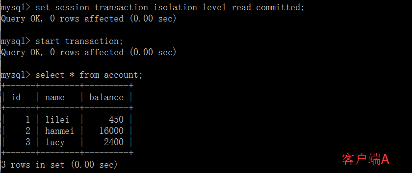 (1)打开一个客户端A,并设置当前事务模式为read committed(读已提交),查询表account的所有记录: