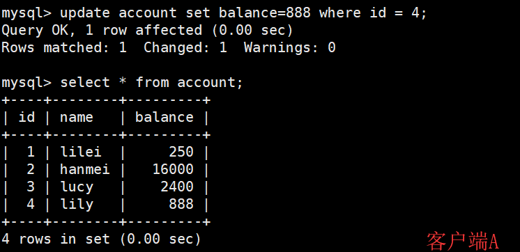 (7)验证幻读:在客户端A执行update account set balance=888 where id = 4;能更新成功,再次查询能查到客户端B新增的数据